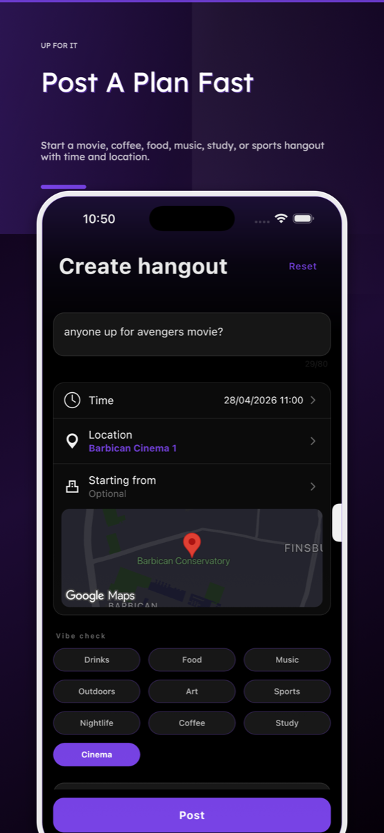 Start with what you want to do, choose a time and place, add a vibe, and publish. It is meant for coffee, food, cinema, sports, music, study plans, and anything else worth doing today.