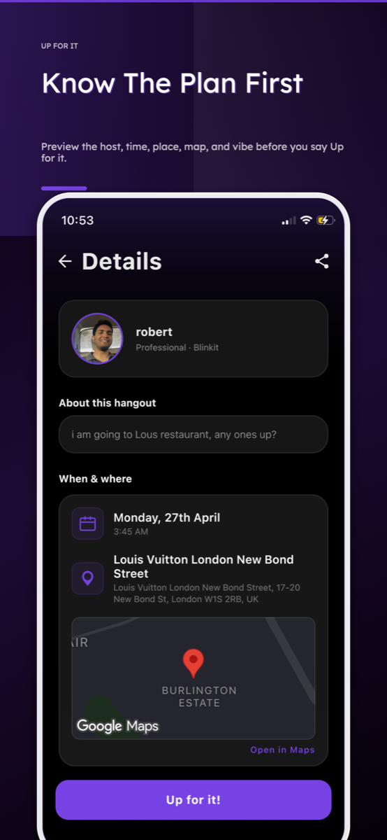 Download Up For It on iPhone and turn nearby plans into real-world hangouts.